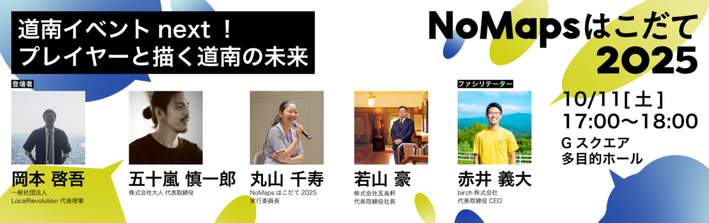 函館コミュニティプラザ Gスクエアを会場に、道南の人や地域をつなげるイベント「道南フェス」の岡本代表、今年7月に初開催したアニメイベント「おもちゃ函」主催者の五島軒若山社長、「Nomapsはこだて」の丸山実行委員長に、札幌の都市型フェス「NoMaps」の五十嵐総合プロデューサーを招き、各イベントの特色や連携共創を通して、道南の熱い未来について語るセッションとなります!